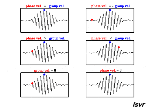 Look at the centre-left figure below, where the phase velocity is greater than the group velocity. The cherry dot indicates the phase velocity, moving forth with the elevation of a wave.